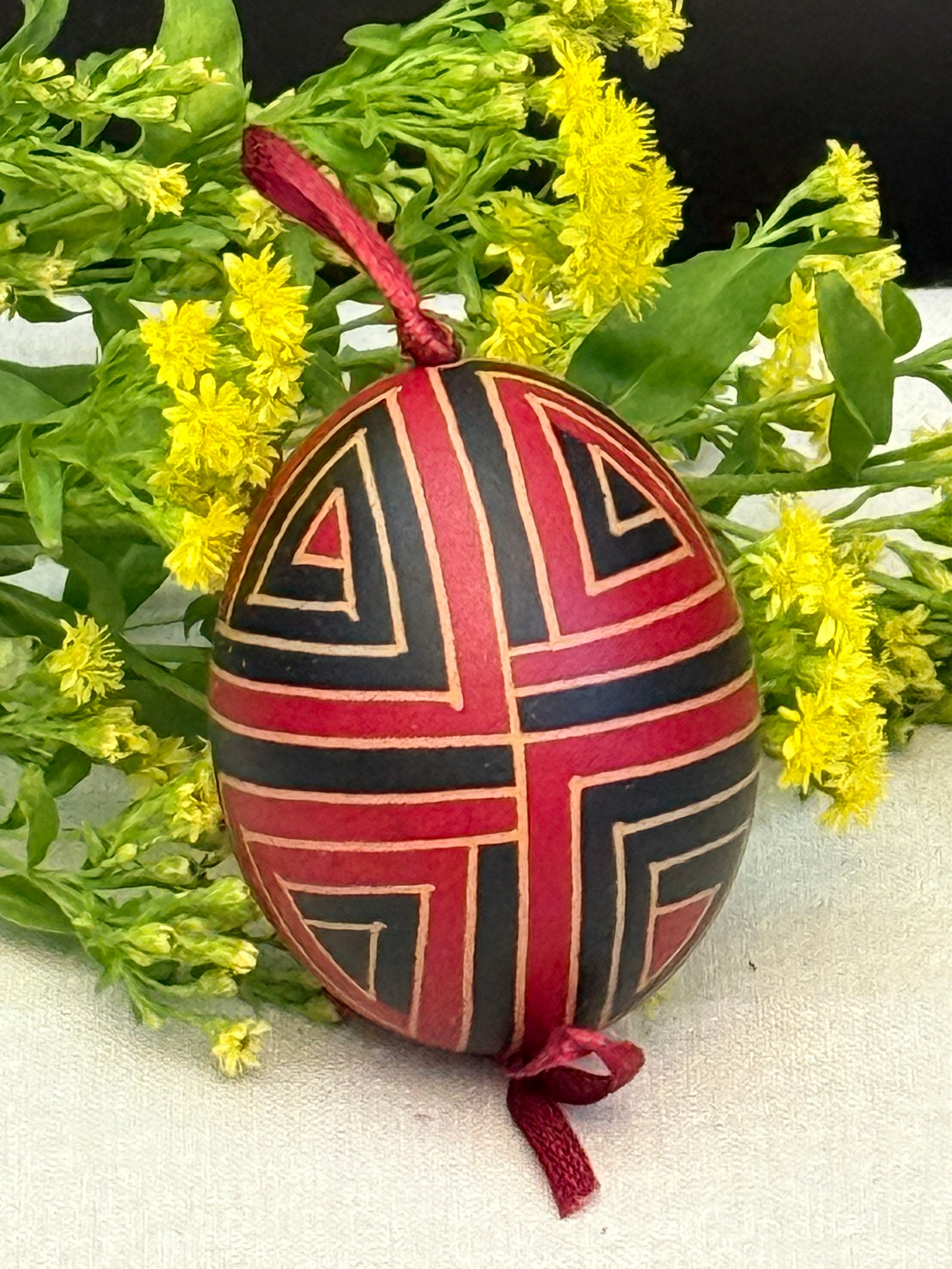 This pysanka reflects the sophisticated art and deep nature connection of the Trypillian culture, which flourished in Ukraine over 5,000 years ago, creating some of Europe's most advanced prehistoric settlements.