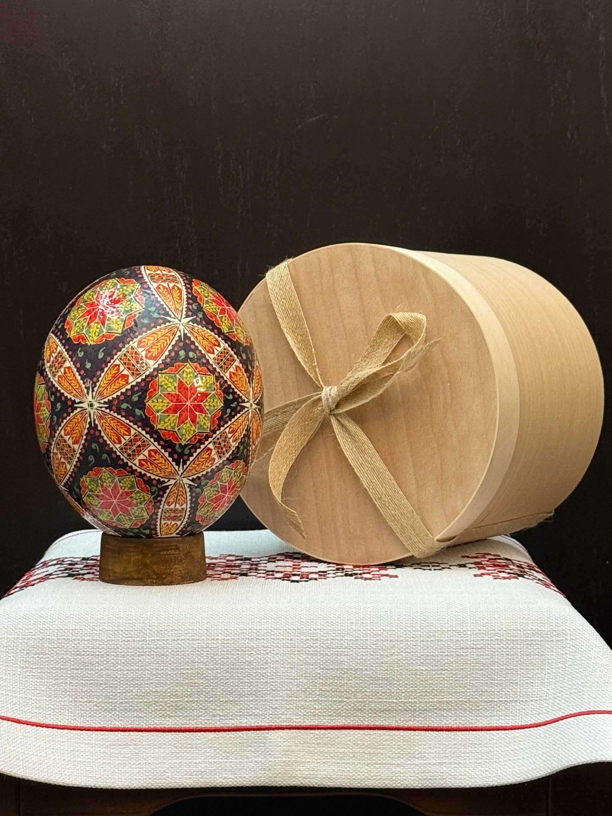 Each ostrich pysanka is meticulously hand-painted by Olha Sakhno, preserving the beauty and meaning of ancient Ukrainian traditions through every brushstroke, making this more than art - it's cultural preservation.