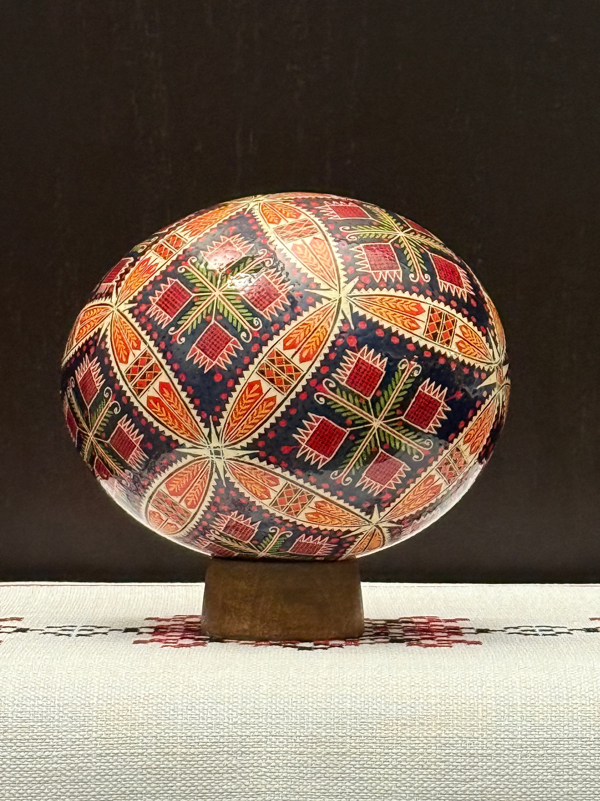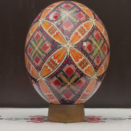 Each ostrich pysanka is meticulously hand-painted by Olha Sakhno, preserving the beauty and meaning of ancient Ukrainian traditions through every brushstroke, making this more than art - it's cultural preservation.