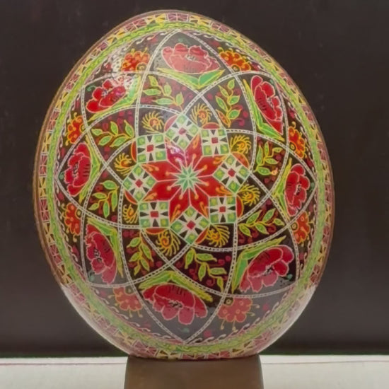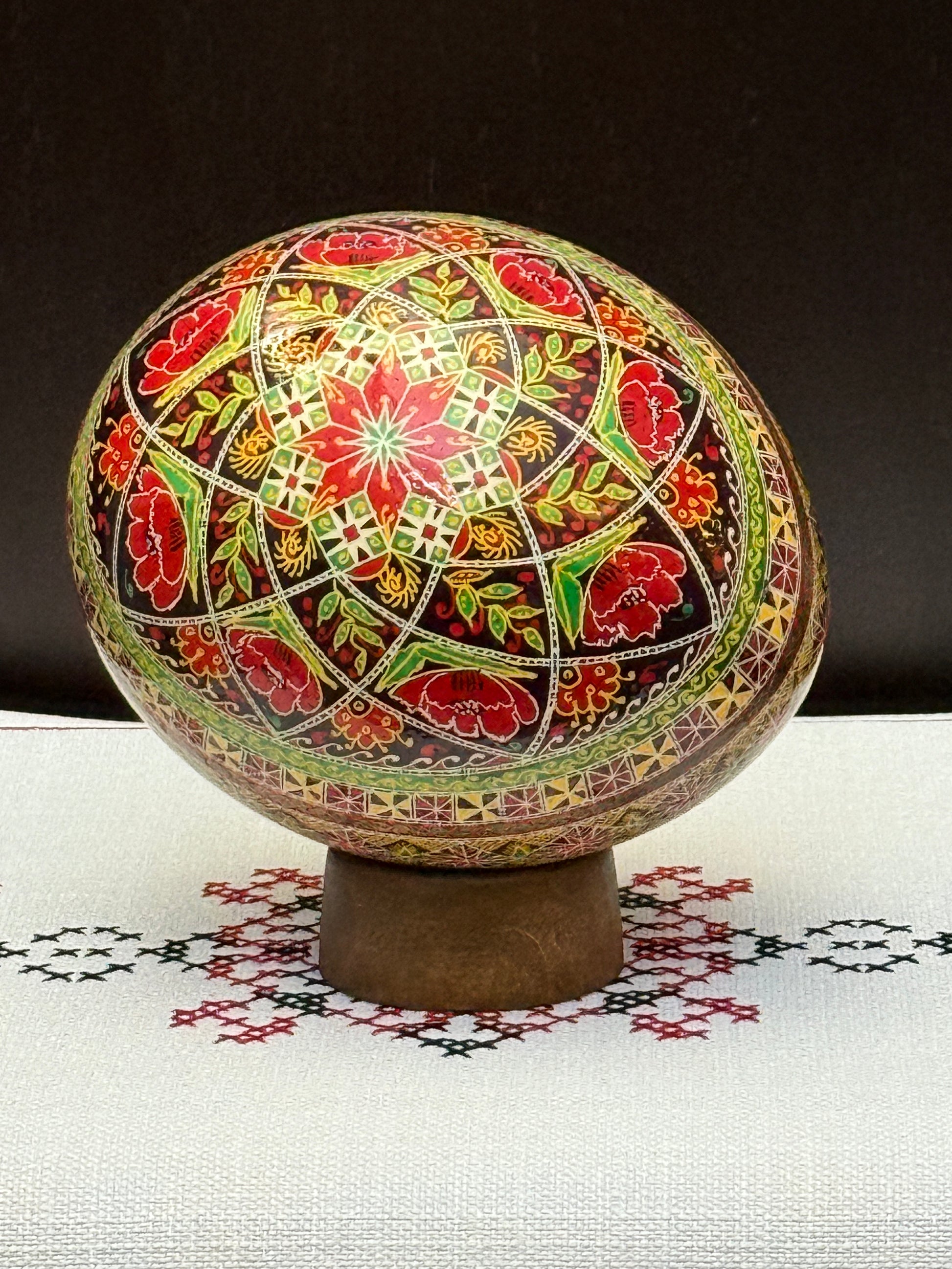 Each ostrich pysanka is meticulously hand-painted by Olha Sakhno, preserving the beauty and meaning of ancient Ukrainian traditions through every brushstroke, making this more than art - it's cultural preservation.