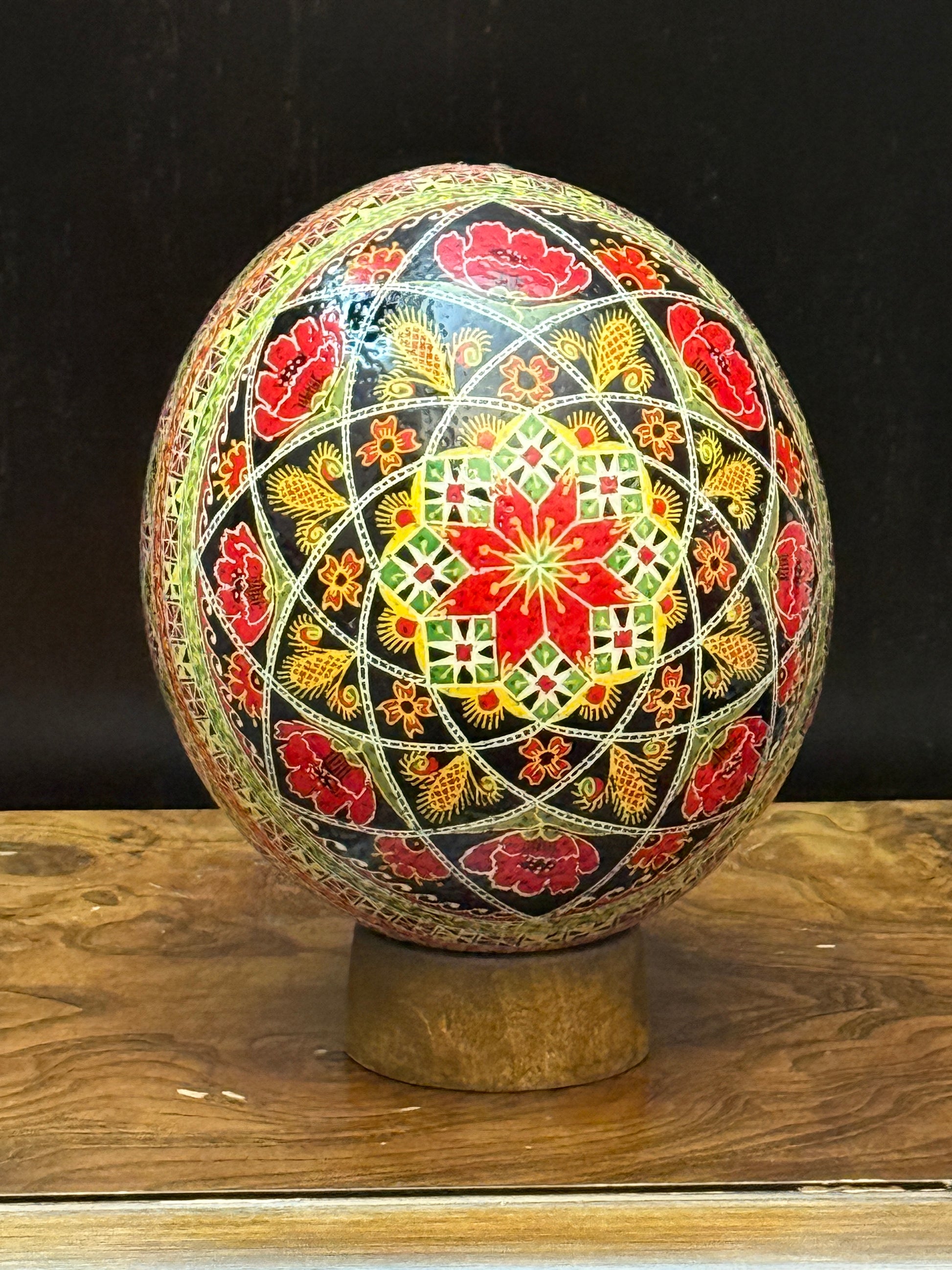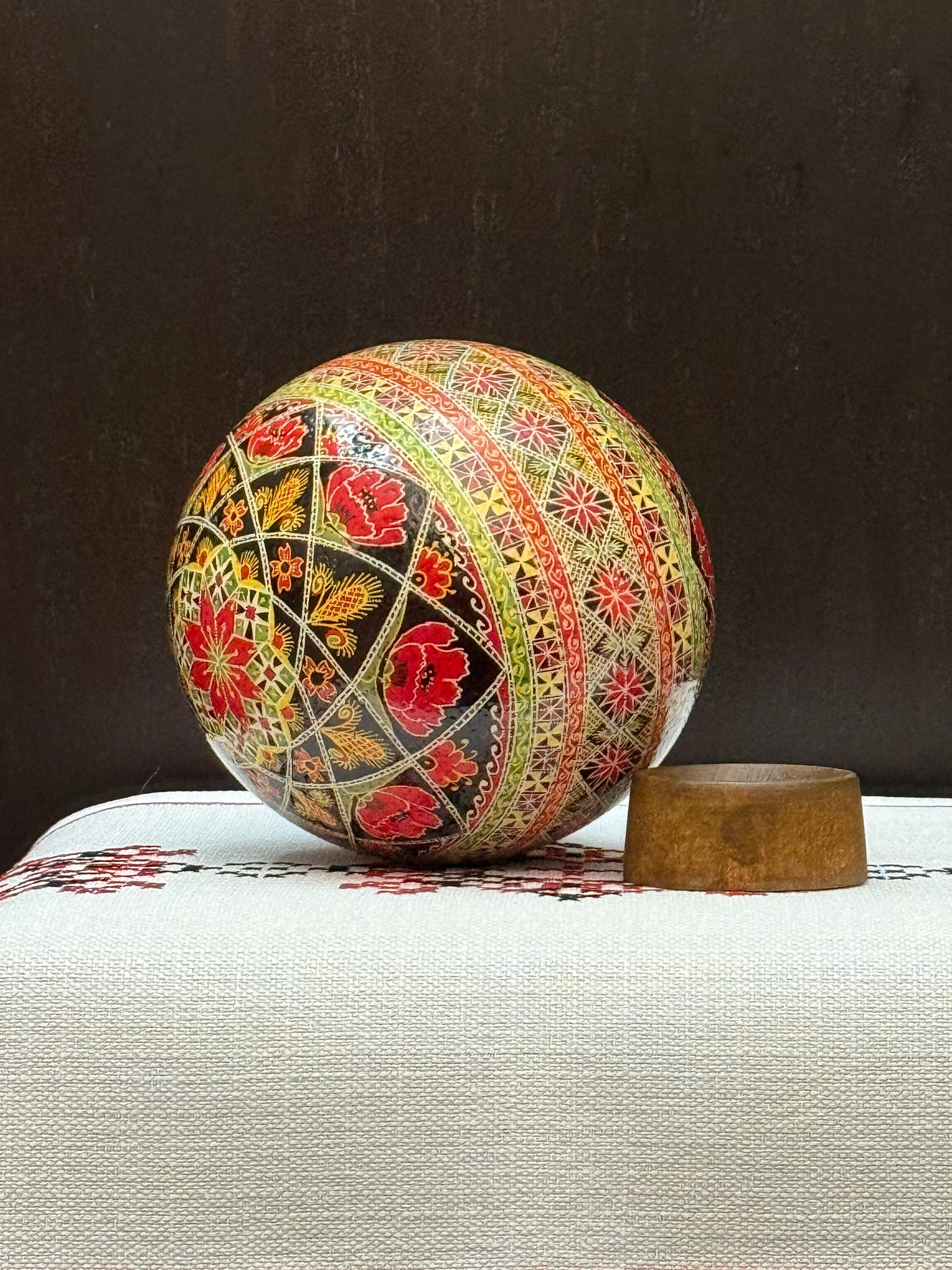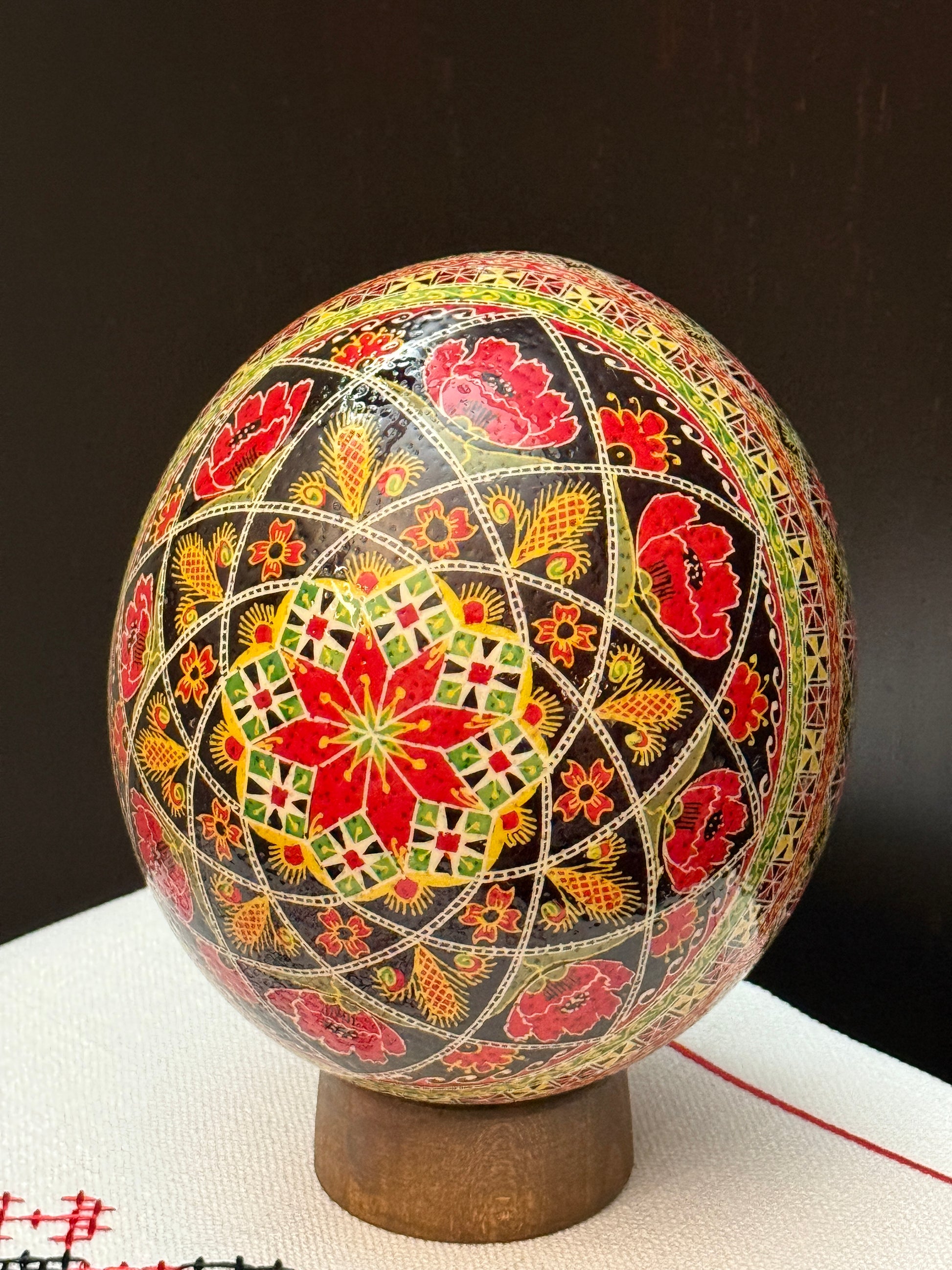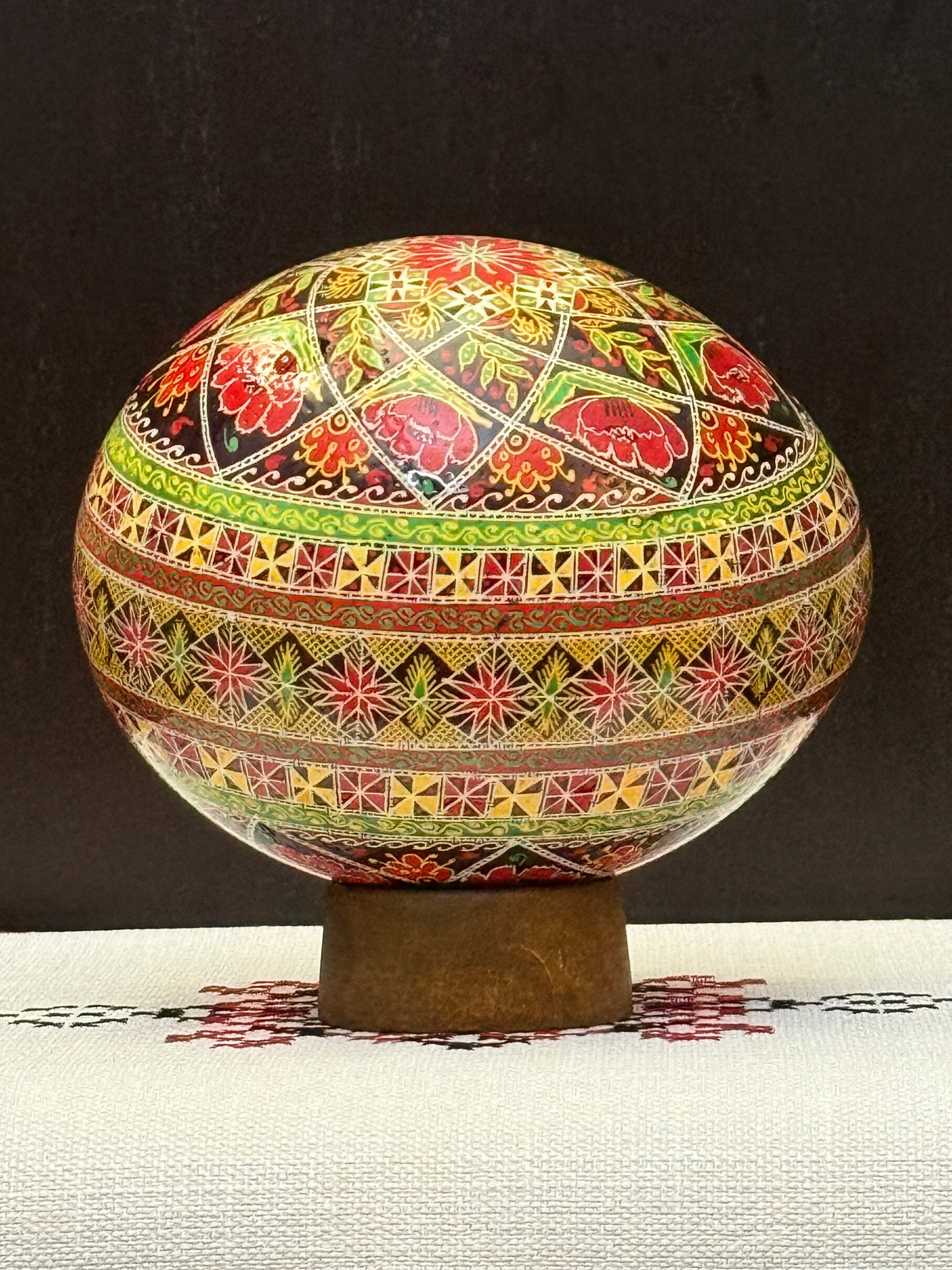 Each ostrich pysanka is meticulously hand-painted by Olha Sakhno, preserving the beauty and meaning of ancient Ukrainian traditions through every brushstroke, making this more than art - it's cultural preservation.