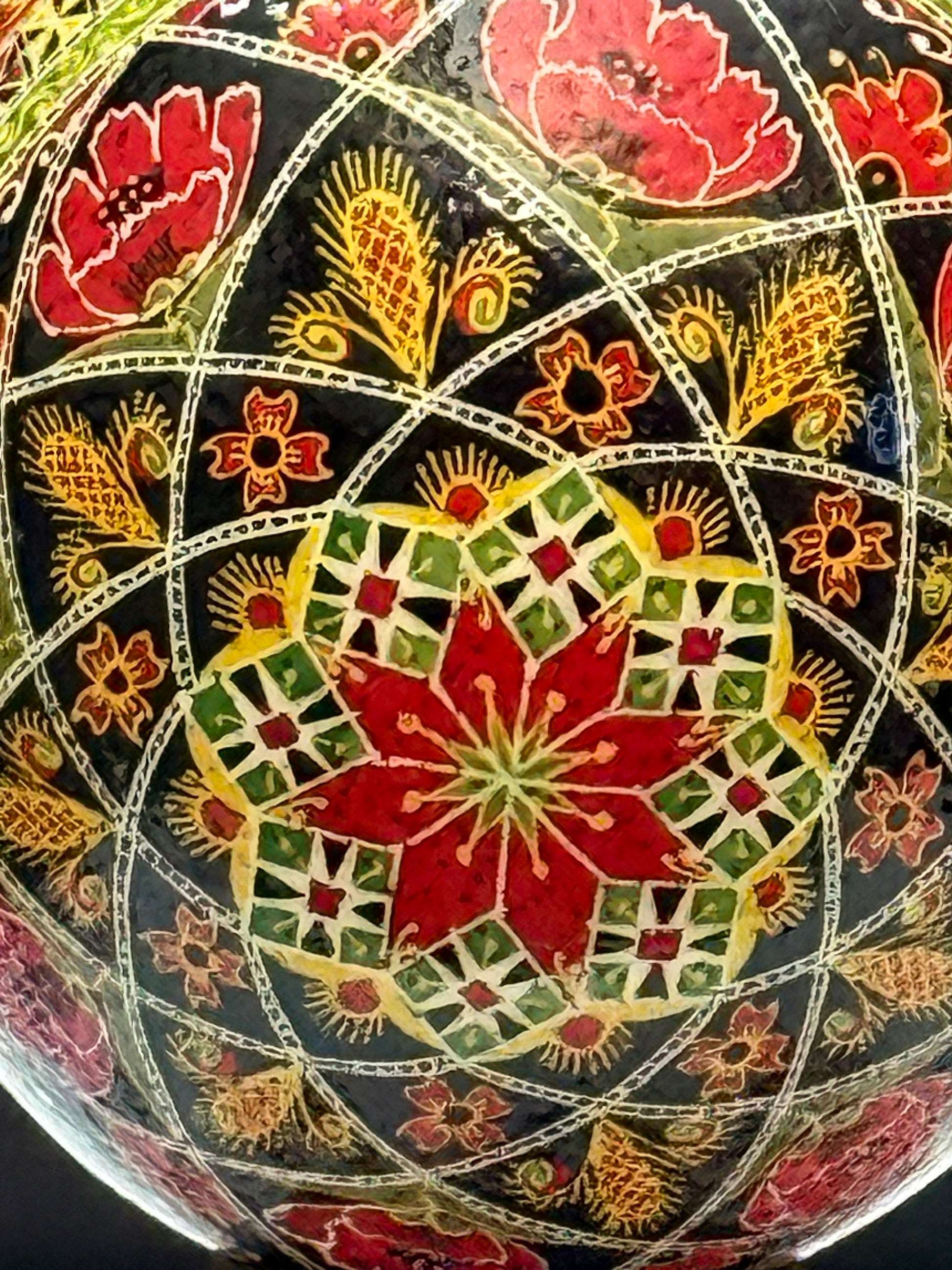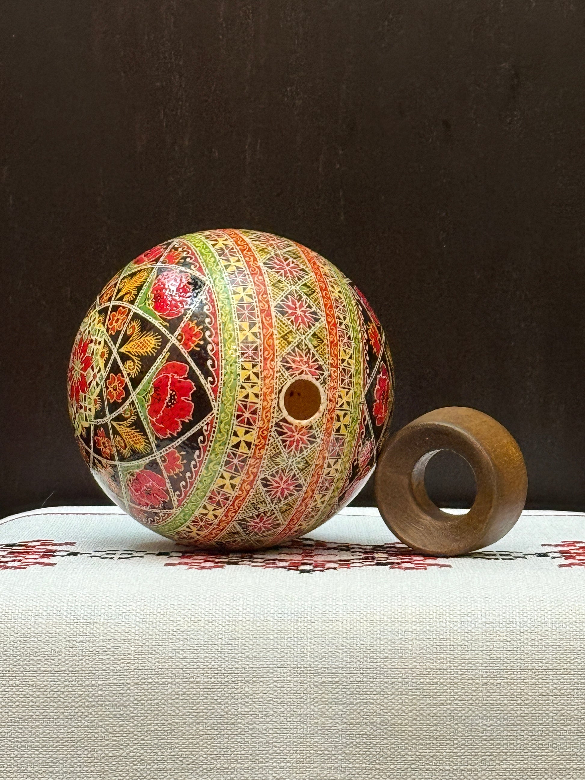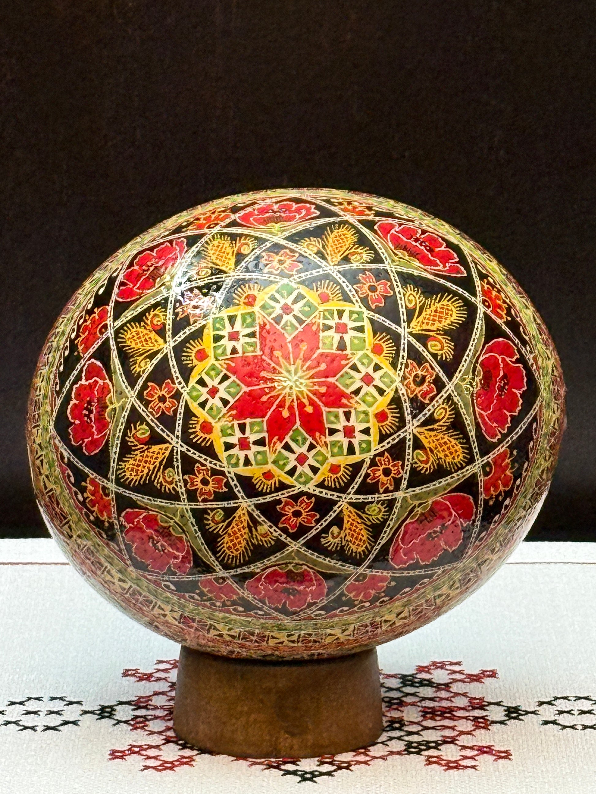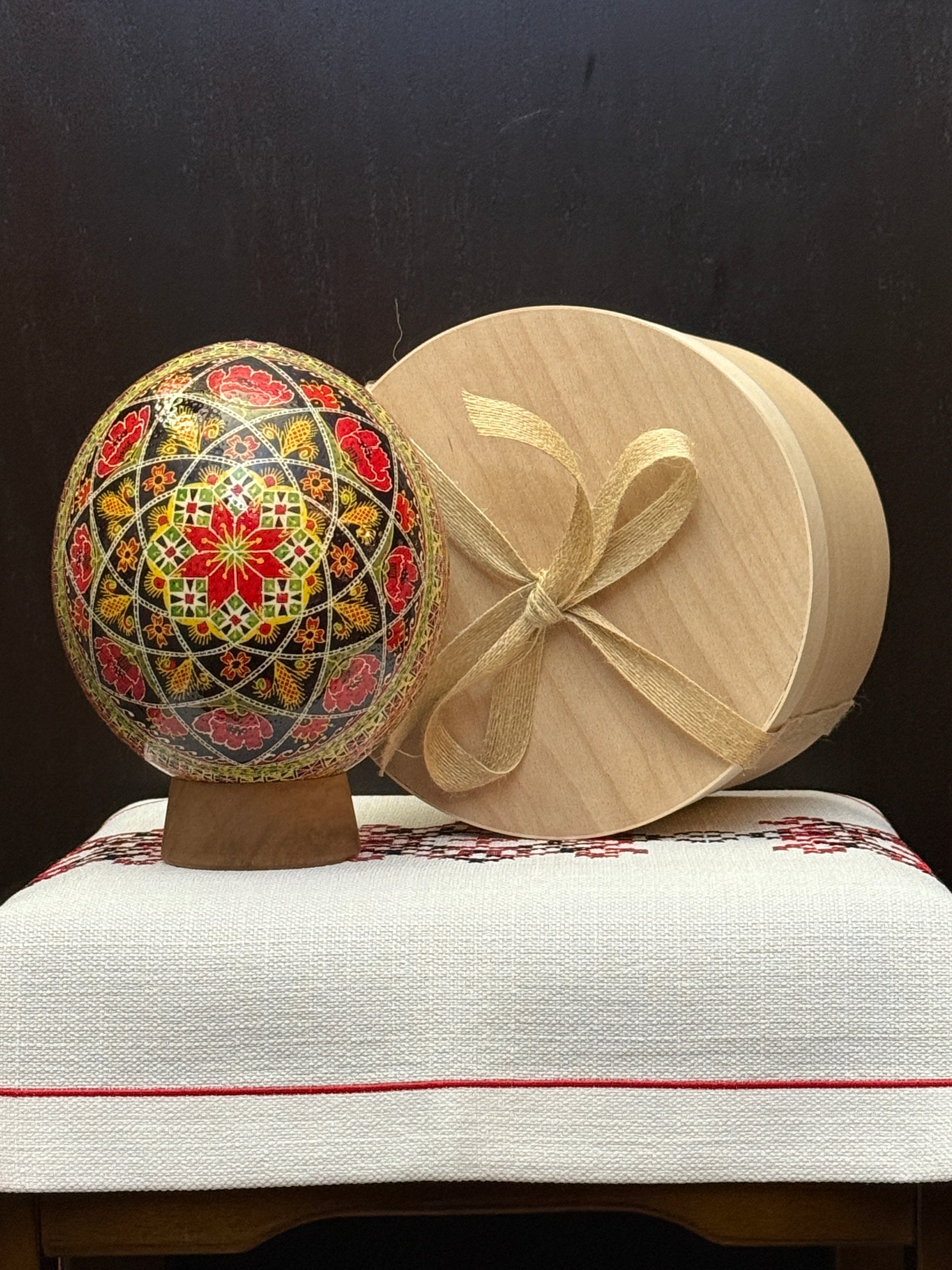 Each ostrich pysanka is meticulously hand-painted by Olha Sakhno, preserving the beauty and meaning of ancient Ukrainian traditions through every brushstroke, making this more than art - it's cultural preservation.