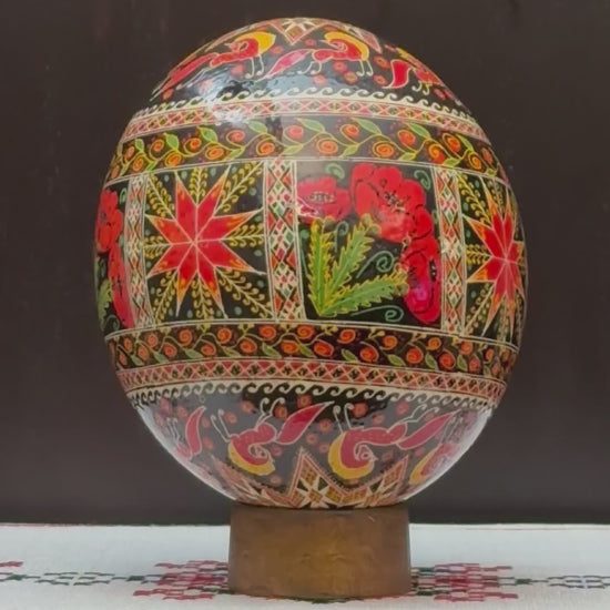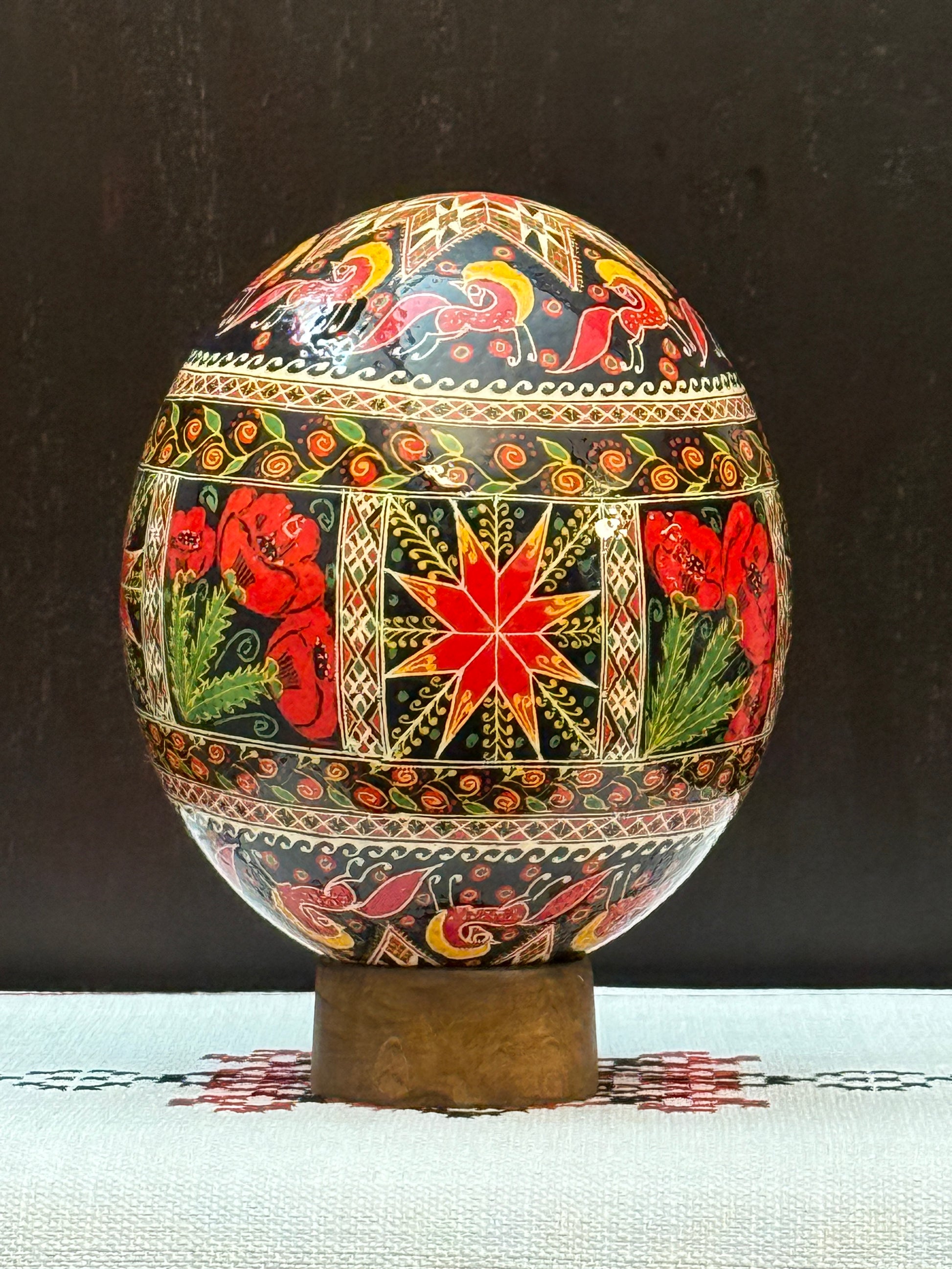 Each ostrich pysanka is meticulously hand-painted by Olha Sakhno, preserving the beauty and meaning of ancient Ukrainian traditions through every brushstroke, making this more than art - it's cultural preservation.
