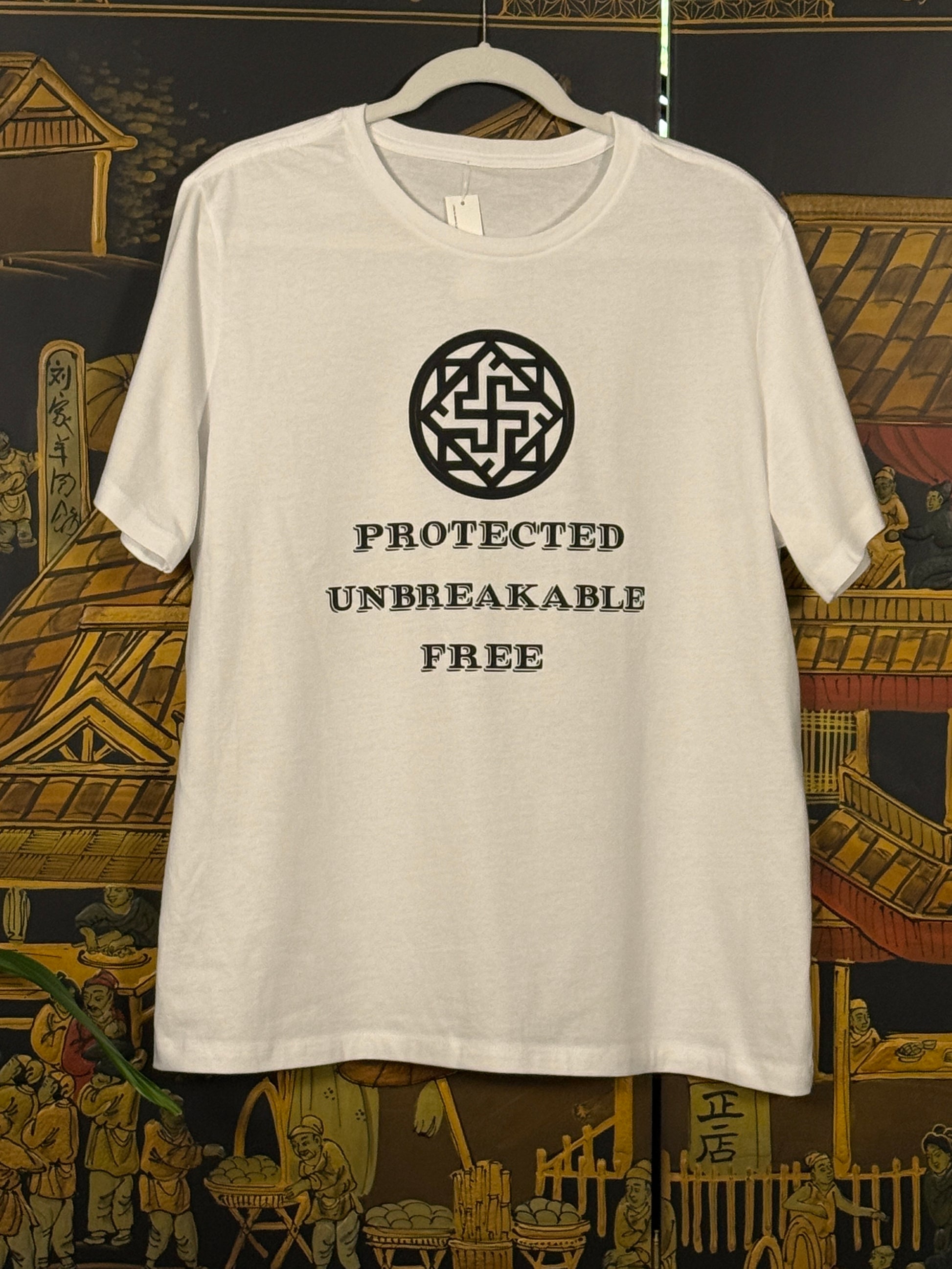 The design features lasting quality that maintains its sacred appearance wash after wash — comfortable for daily wear while carrying a powerful message of protection.