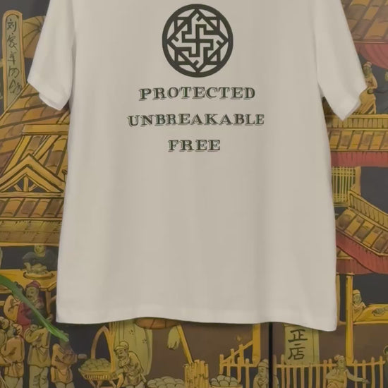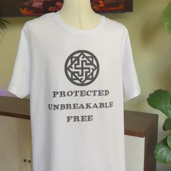 This powerful tee features a striking black protective rune of Svarog, paired with the empowering message: "Protected Unbreakable Free" — a symbol of ancient wisdom, spiritual guardianship, and the eternal strength that comes from ancestral protection and divine freedom.