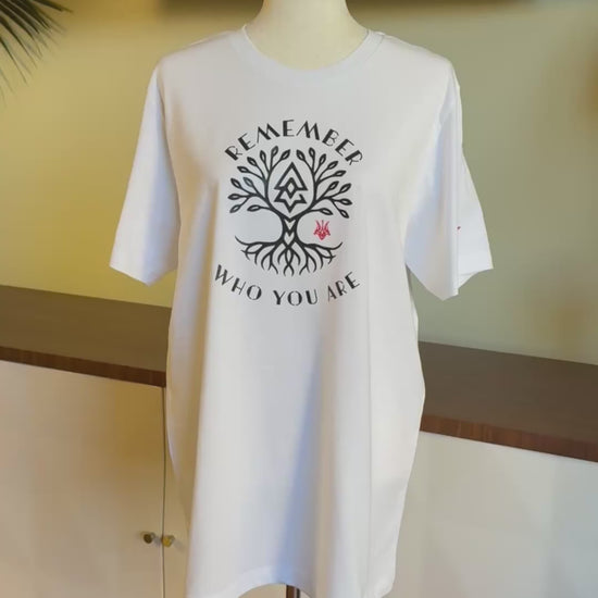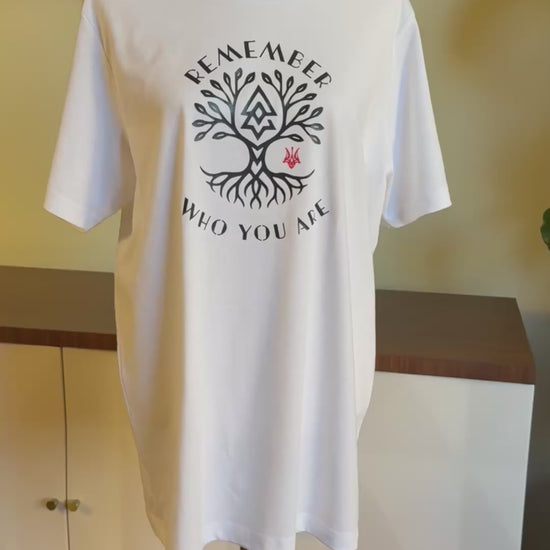 This powerful tee features striking world tree imagery in ancient Norse style, encircled by the profound message: "Remember Who You are" – accented with a red Ukrainian Tryzub beside the tree and a red dragon detail on the sleeve, creating a unique fusion of Norse mythology and Ukrainian heritage symbolizing strength, identity, and ancestral connection.