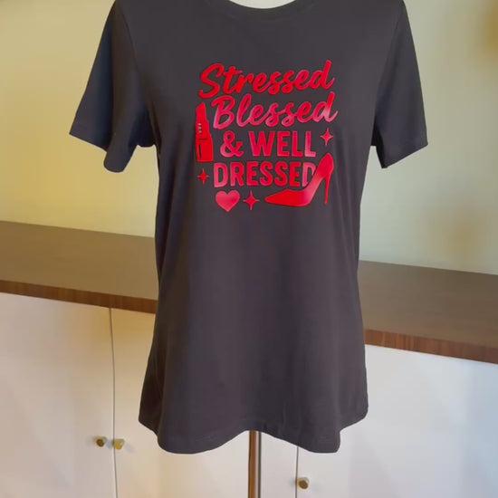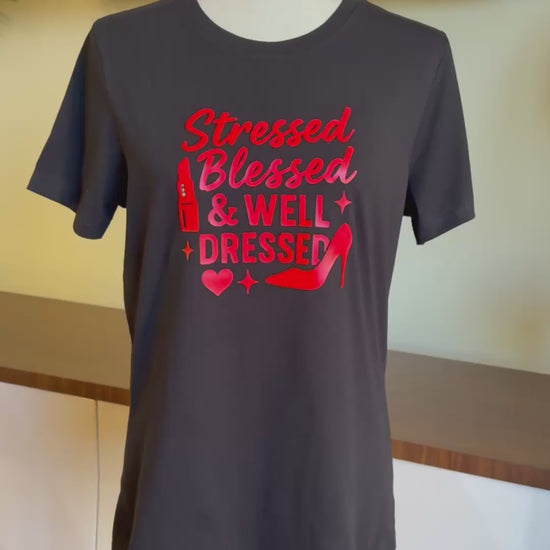 Bold Red Slogan - Striking "Stressed Blessed & WELL DRESSED" message popping against dark background