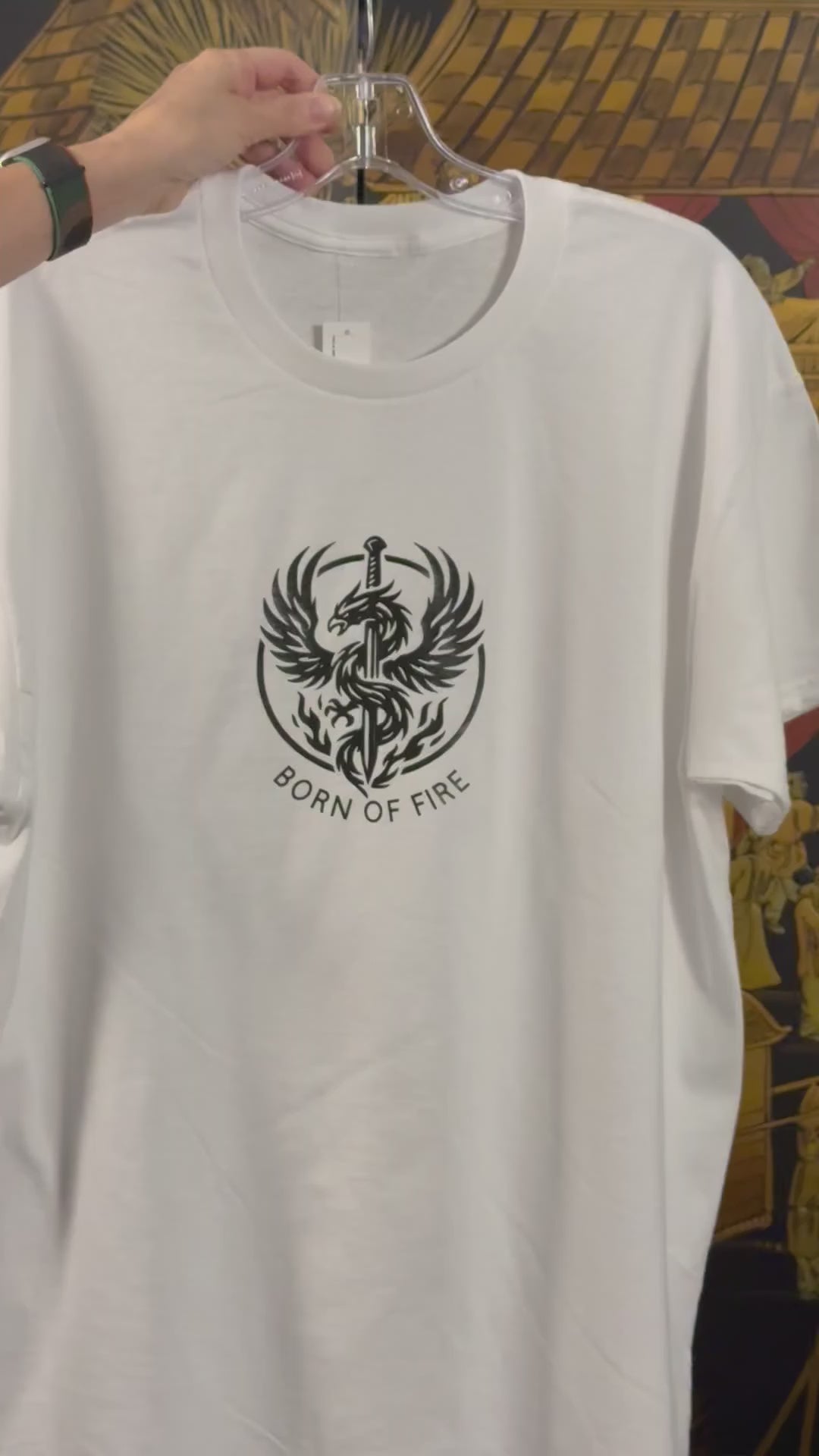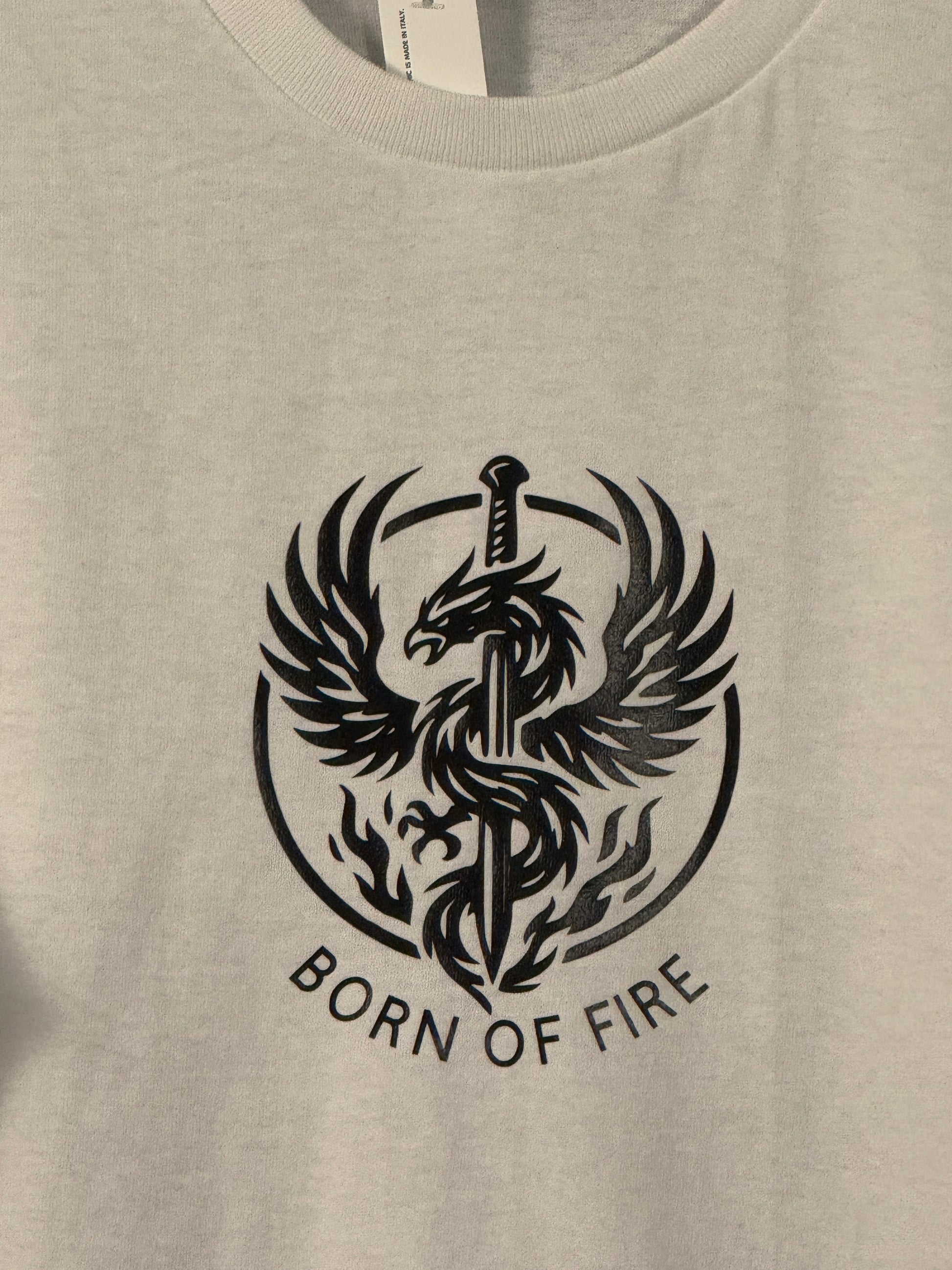 Rise with power. This bold tee features a fierce phoenix wrapped around a sword, symbolizing rebirth, resilience, and strength forged through adversity. Below, the phrase "BORN OF FIRE" declares your unstoppable spirit.