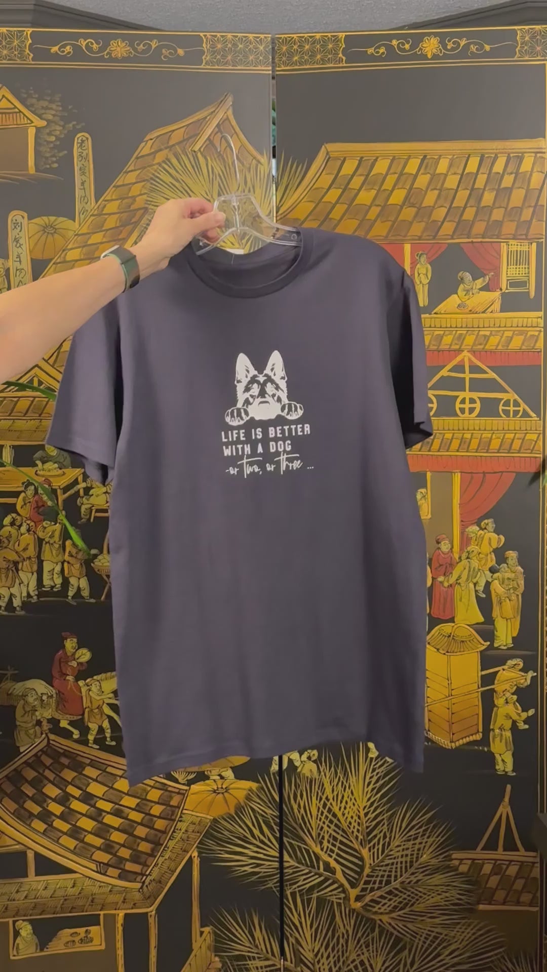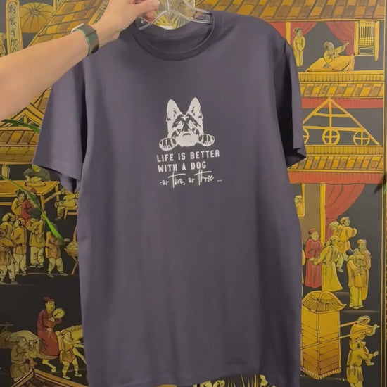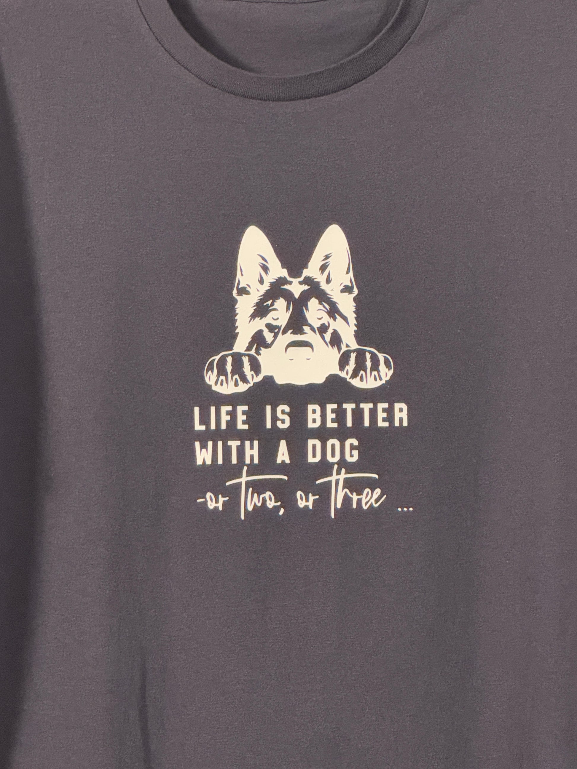 Featuring a charming pup graphic and the playful phrase: "Life is better with a dog… or two, or three…" — this shirt speaks the truth every dog person knows.