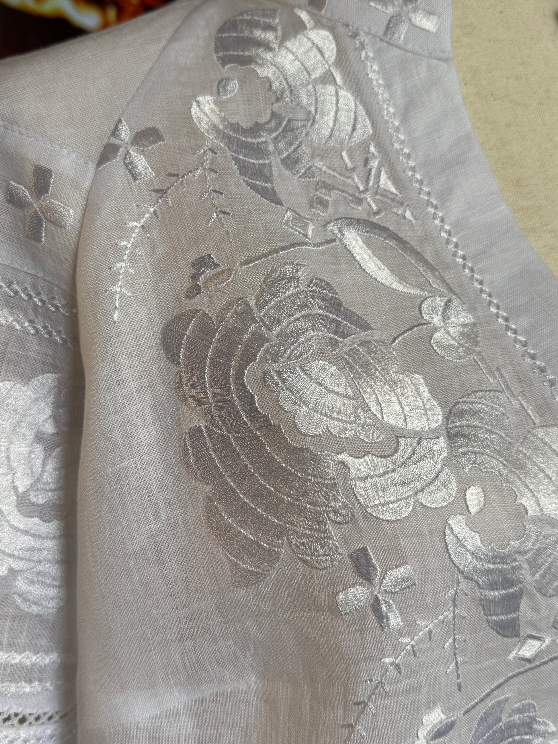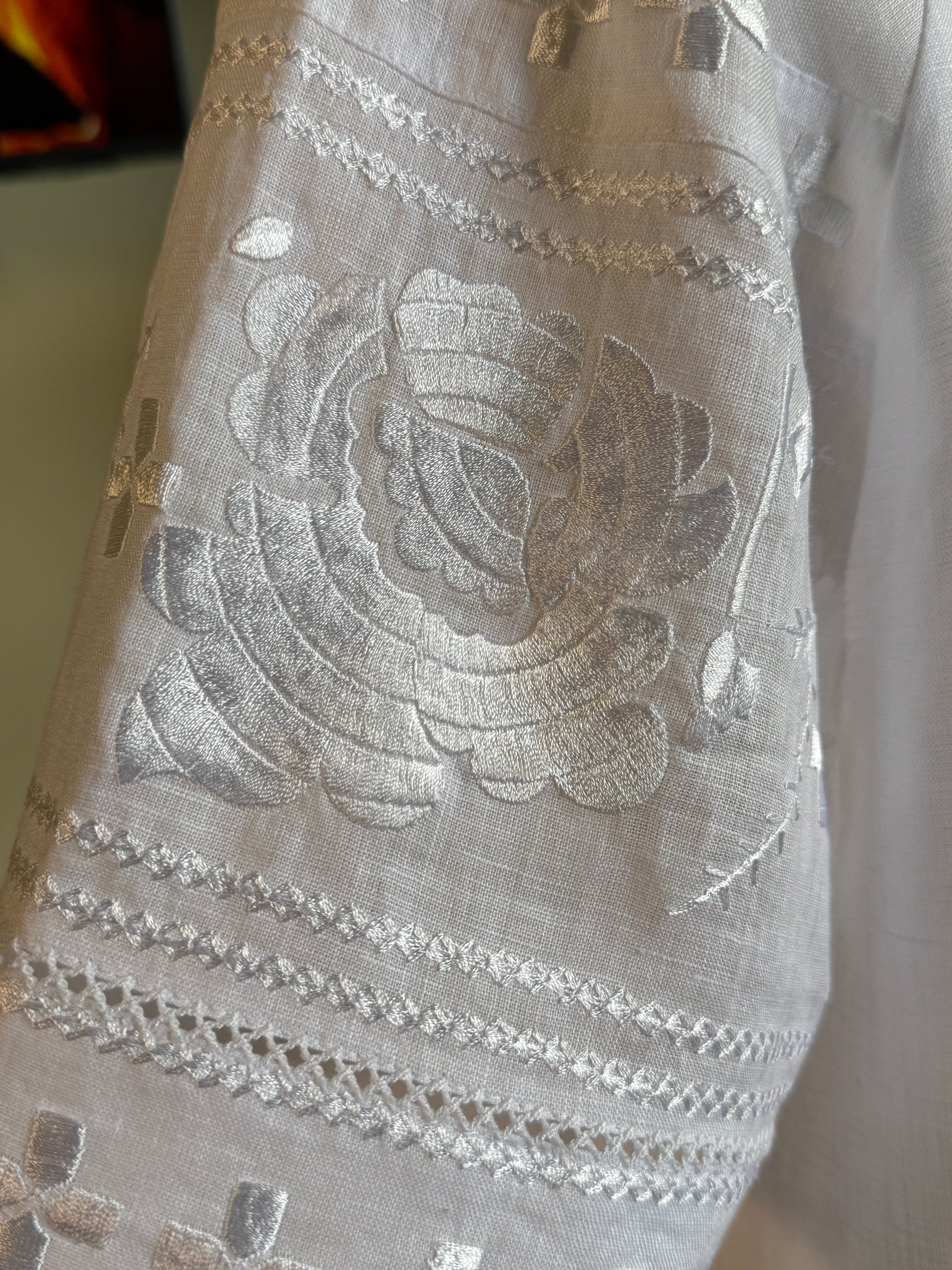 Cutwork Sleeve Accents - Traditional technique adds textural interest and breathable elegance