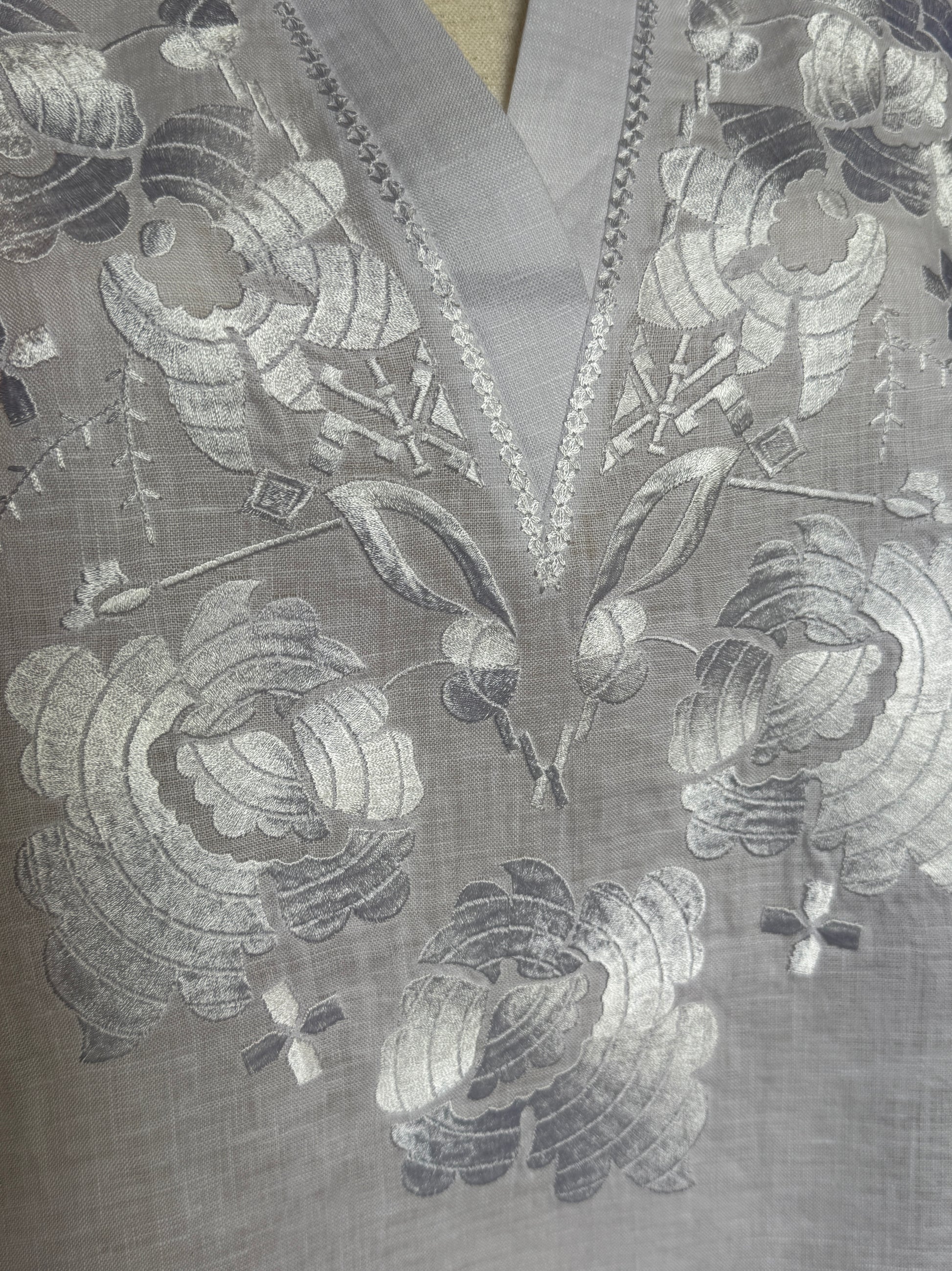 Exquisite Machine Embroidery - White-on-white floral patterns on chest and sleeves for sophisticated detail